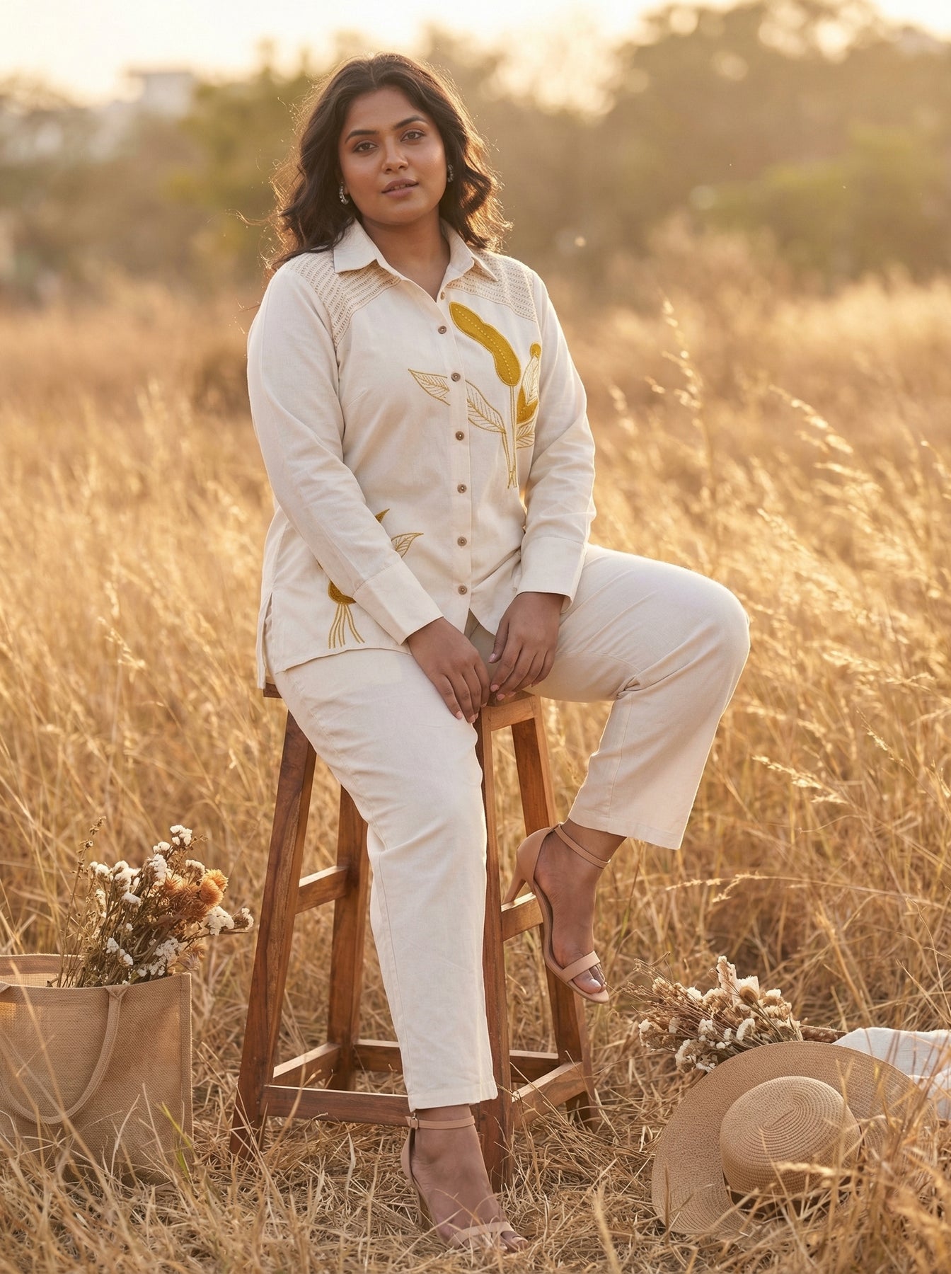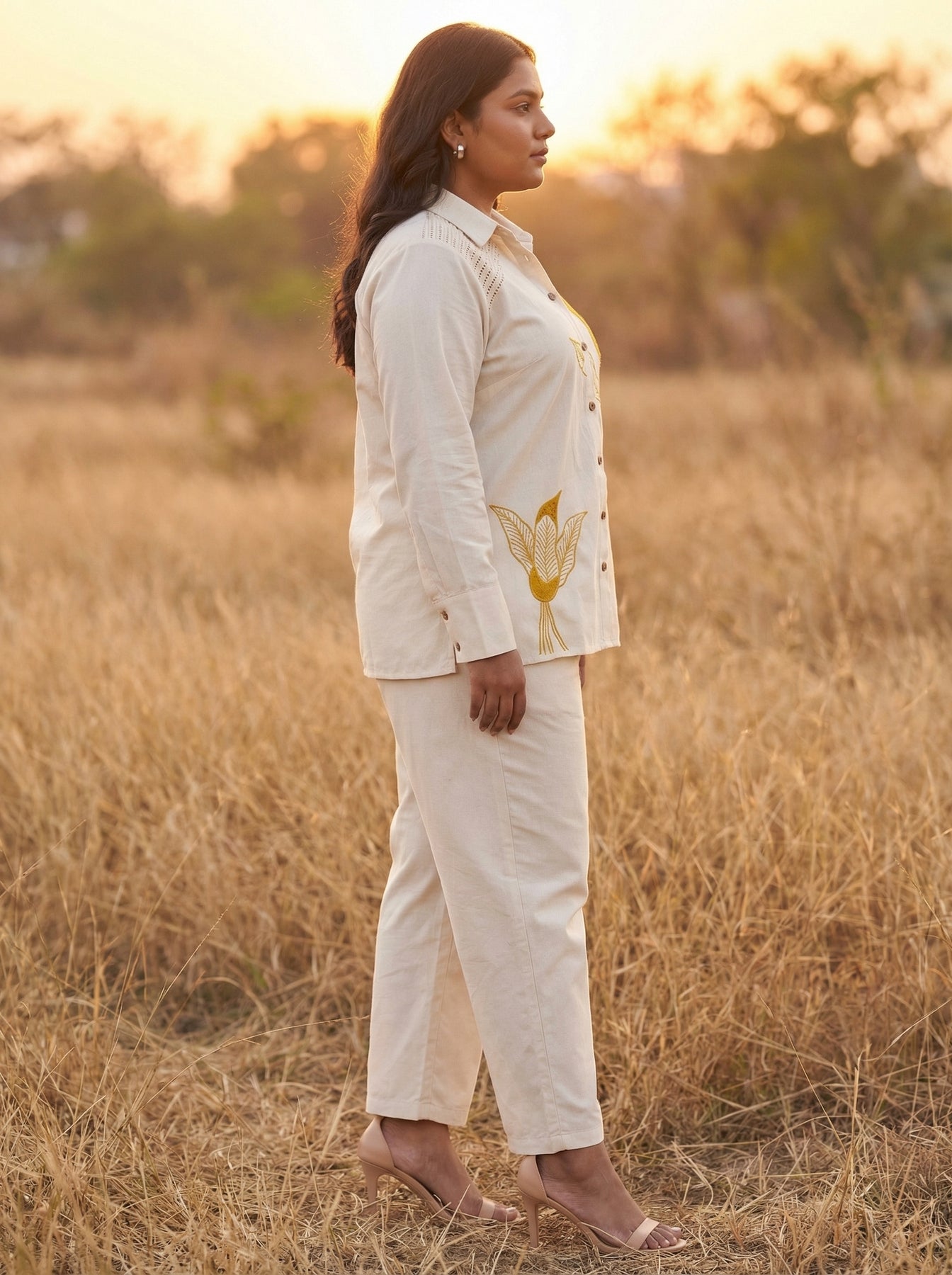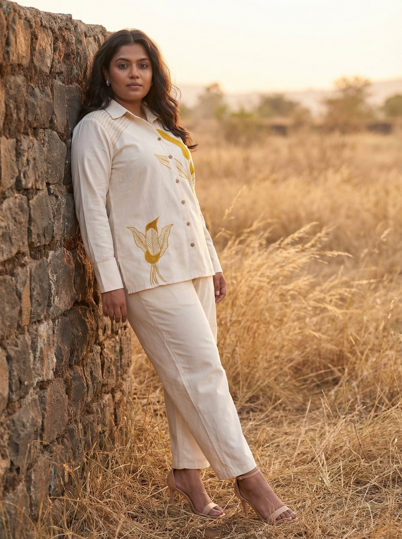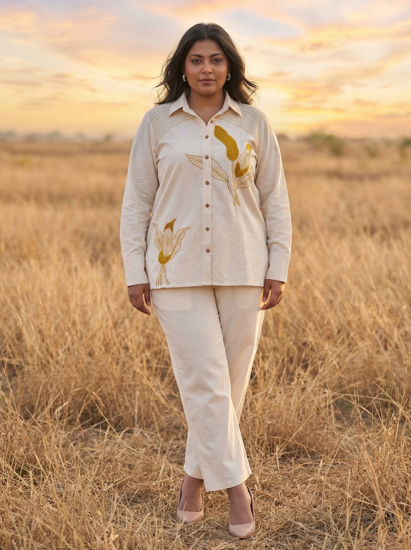 Shop summer co ord set for women in Ahmedabad. Discover trendy, breathable and stylish outfits perfect for casual wear and summer fashion. Are You Looking For Chic Resort Wear Co-ords That Provide Coverage To Save You From Sunburn? Our Natural Casual Cotton Co Ords Are The Perfect Match For You. The Off-white Collared Shirt Is Adorned With Handwork Of A Vibrant Orchid Floral Motif. Roll Up The Sleeves For An Edgy Appeal. The Long Cotton Loose Pants Create A Laid-back Yet Graceful Apparel For A Day Full Of Exploration. Pair It With Your Casual Flat And Statement Jewelry As You Explore The Delicacies From The Local Hot Spots.