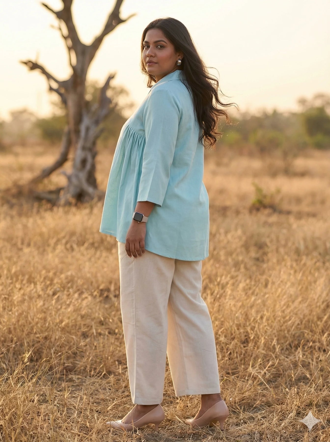 Shop summer co ord set for women in Kolkata. Discover trendy, breathable and stylish outfits perfect for casual wear and summer fashion. Do You Want Classic Yet Casual Apparel When Sightseeing On Your Resort Vacation? Curvy Lane's Has Got Your Back! We Present Our Minimal Yet Classy Summer Co-ords, Including A Sky-blue Collared Top With Loose White Pants For A Casual Yet Alluring Aesthetic! The Sky Blue Shirt With The Breathy Fabric Is Perfect For Days When The Sun Shines Bright. Pair It With Some Boho Jewellery For A Vacation Vibe Or Minimal Jewellery To Wear Daily; Let Your Hair Loose For An Effortless Finish To Your Outfit!