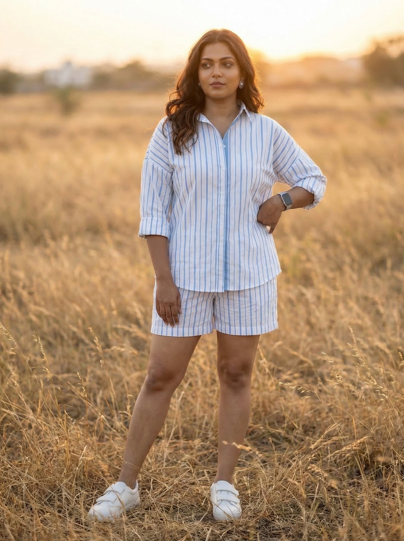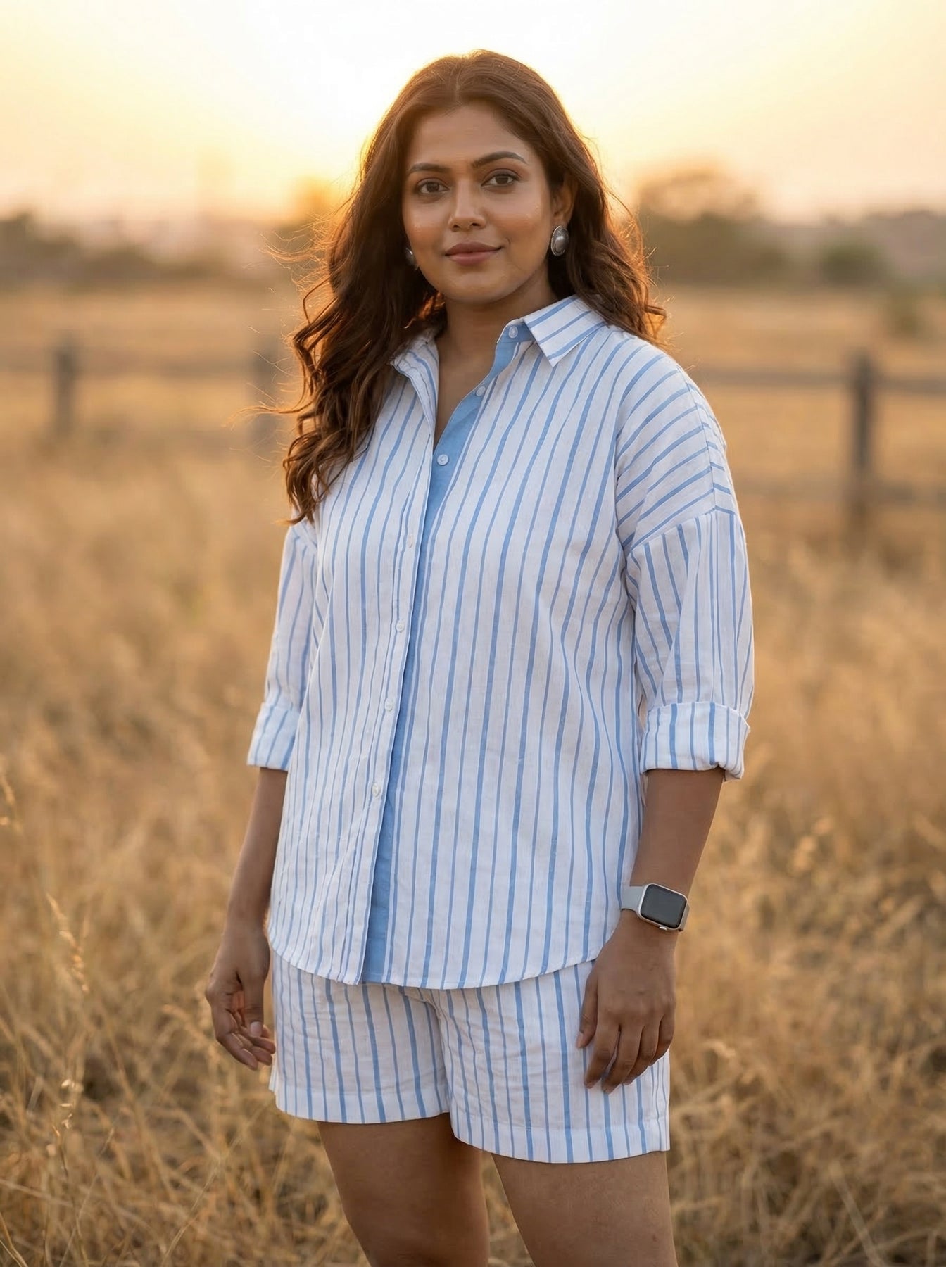 Our sky blue co-ord loose shirt and shorts are classic resort casual for ladies. This casual shirt is made with high-quality cotton and provides the utmost comfort for hanging out by the beach or having brunch at nearby cafes. If you want casual for your outings, you can add a belt and statement jewellery to elevate the visual appeal of the outfit. You can also fold the full sleeves and tuck the shirt into the shorts to create an effortless look! Don't forget to add a bag and some comfy footwear to roam around the place!