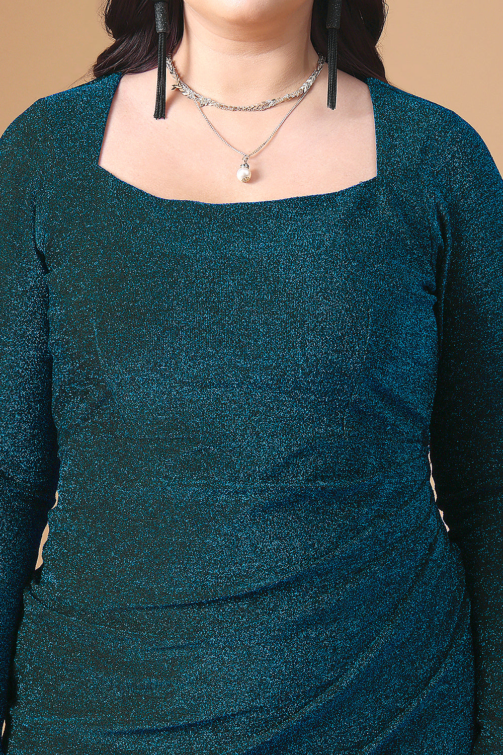 Step Into Elegance With Our Long-Sleeve Pleated Shimmer Midi Dress, the Perfect Blend of Sophistication and Glamour for Your Evening Events. Crafted From a Shimmering Fabric That Catches the Light Beautifully, This Dress Ensures You Make a Statement at Every Step. the Long Sleeves Add a Touch of Refinement, while the Pleated Midi-Length Dress Creates Graceful Movement, Making It Ideal for twirling on the Dance Floor or Gliding Through an Elegant Dinner Date. Designed to Flatter Your Silhouette Effortlessly, This Dress Is Perfect for Cocktail Parties, Evening Dinners, and Special Occasions Where You Want to Shine With Confidence. Pair It With Statement Heels and Minimal Accessories for a Chic, Polished Look That Exudes Timeless Charm.