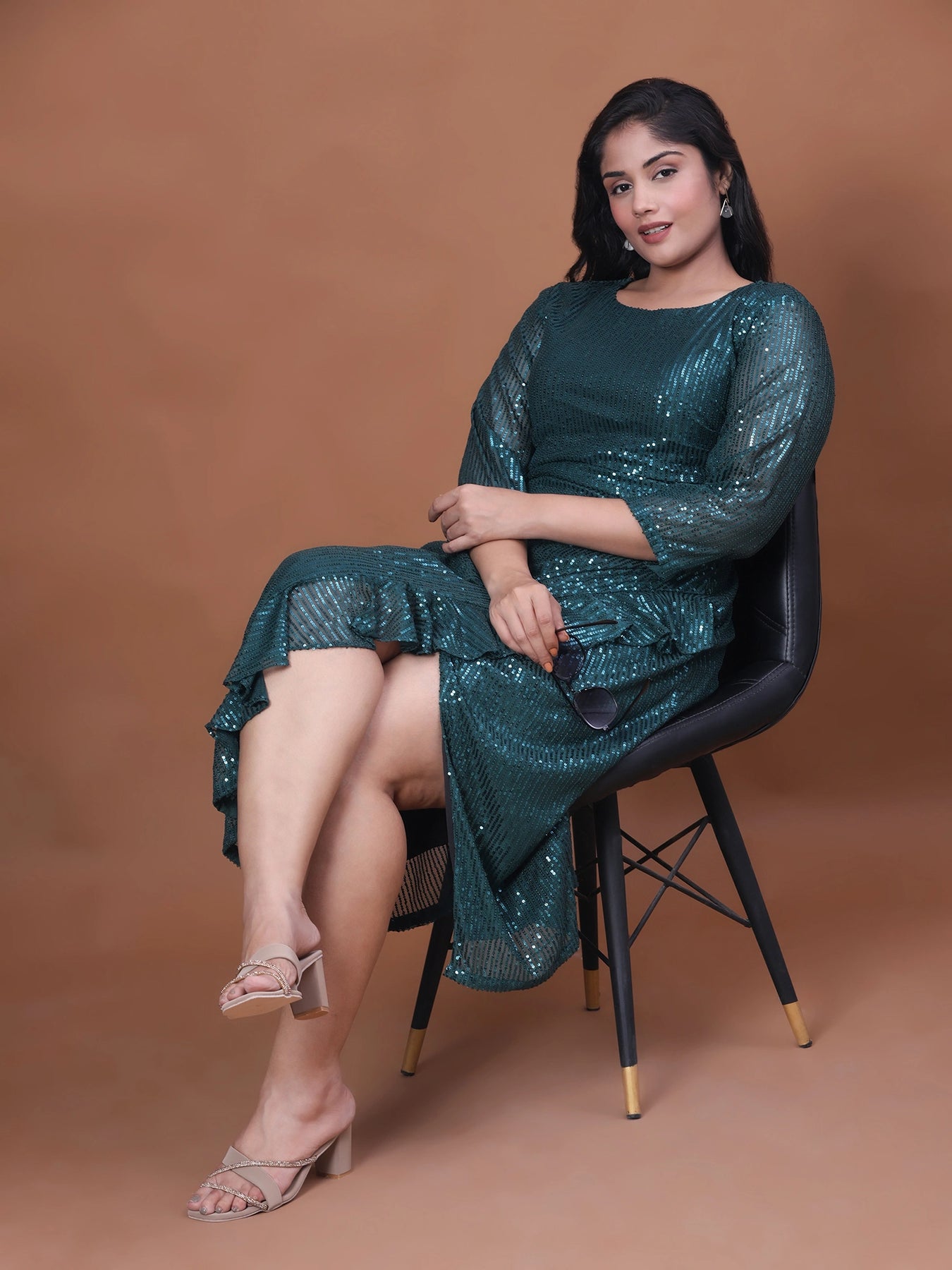 Green Stylish Tulip Hemline Sequin Dress For Family Parties