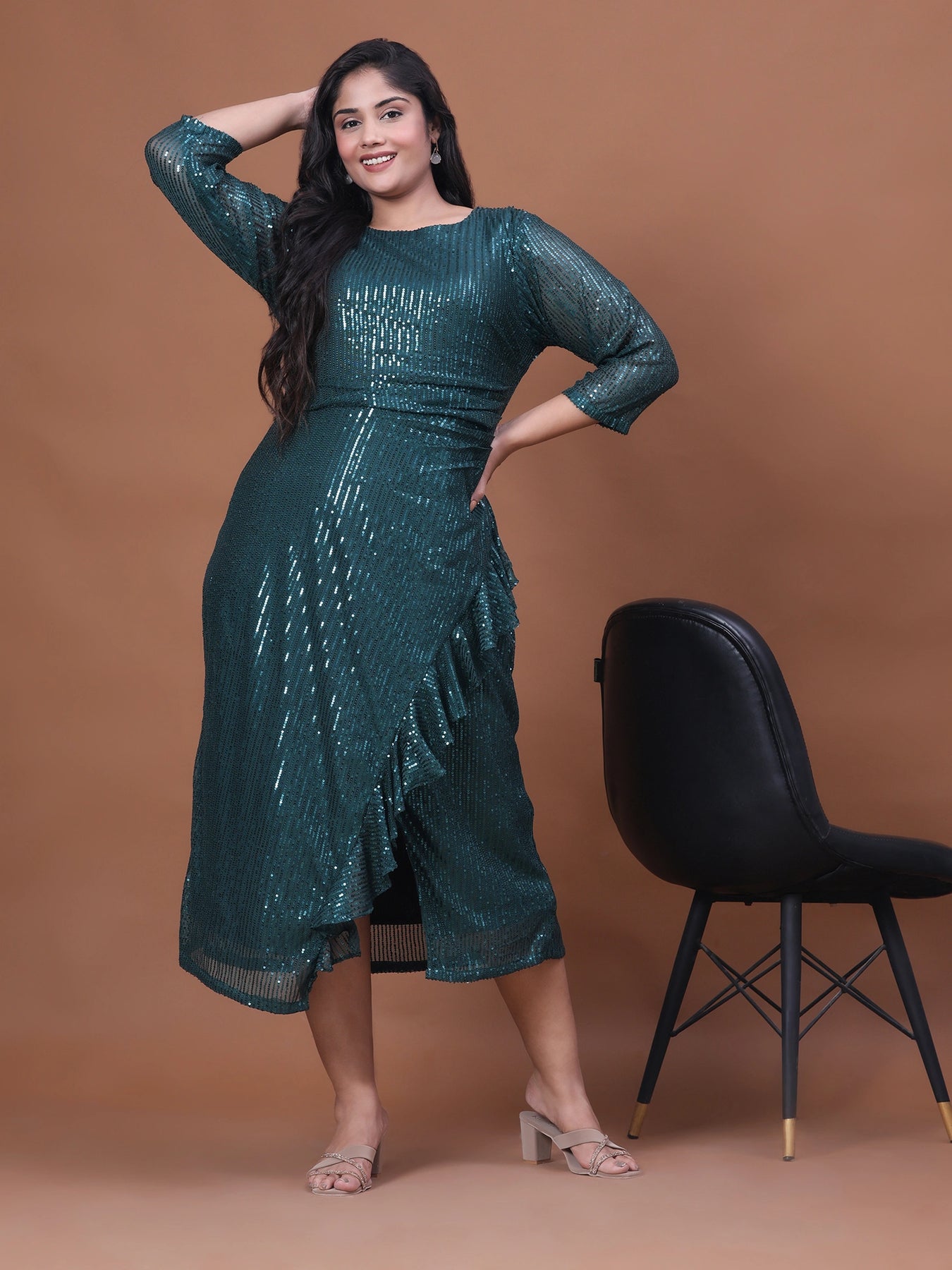 Our bottle green overlap dress is made with stretchable Lycra fabric with sequins. Therefore, it provides your comfort while creating a stunning visual appeal. The tulip hemline of the sequin dress for women and the pleated ruffle are like the cherry on the cake for this dress. The midi length makes it ideal for parties with both friends and family. Pair the outfit with simple jewellery and let the dress shine.
